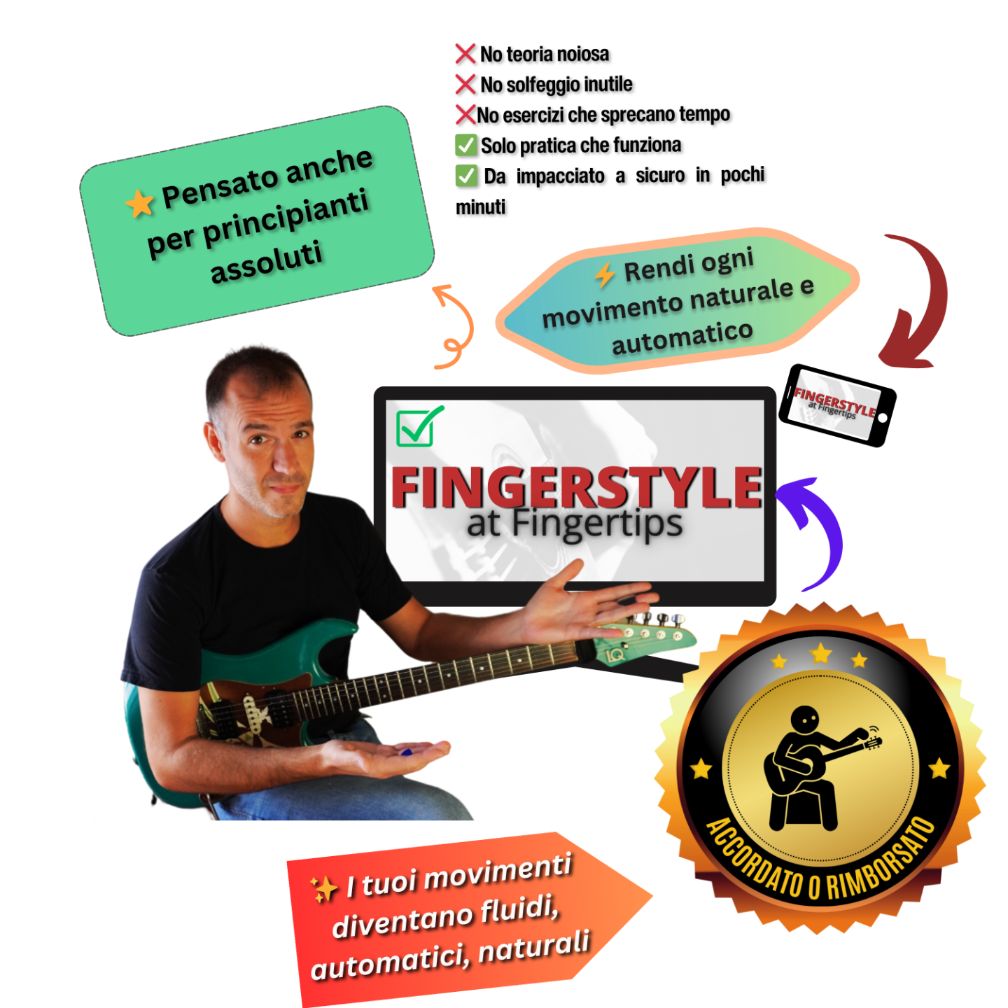 👉 A differenza dei soliti corsi pieni di teoria inutile, tecnicismi e esercizi che non userai mai, questo percorso è stato creato con un unico obiettivo: farti suonare il fingerstyle davvero.