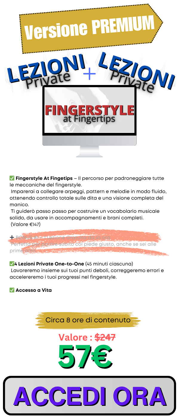 Se vuoi fare un passo in più e completare davvero il tuo percorso nel fingerstyle, il Pacchetto Premium è quello che fa per te.