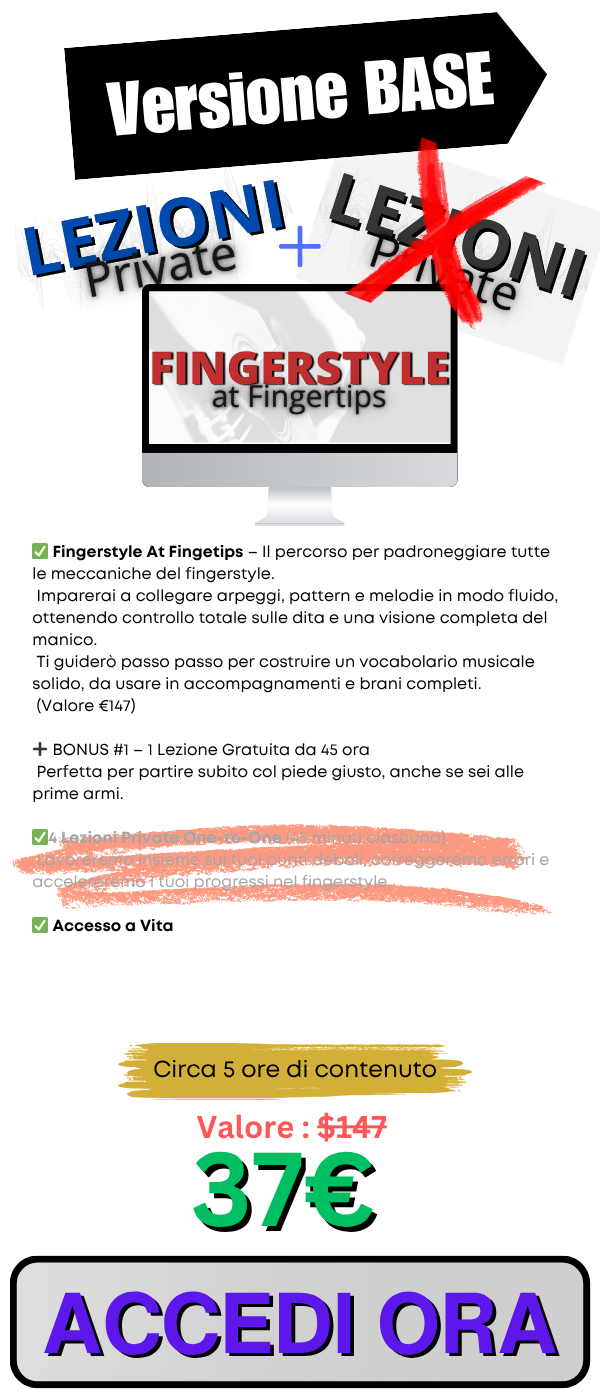 👉 Con il corso Fingerstyle at Fingertips scoprirai quanto sia semplice suonare ciò che prima sembrava fuori portata.